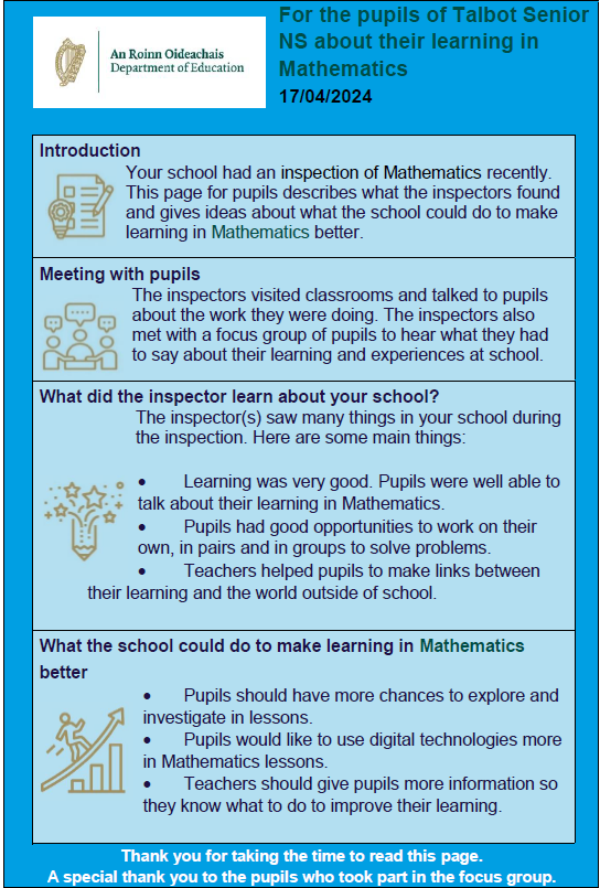 Letter to the Pupils of Talbot Senior NS from the Department of Education